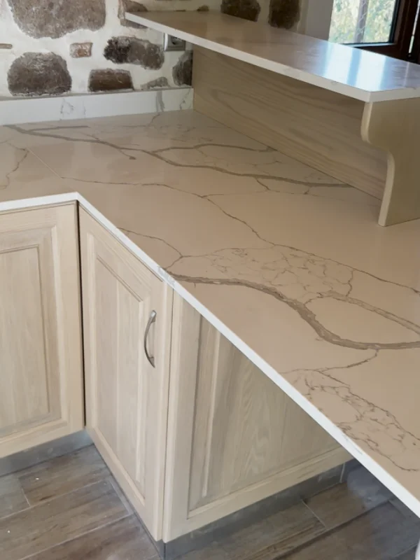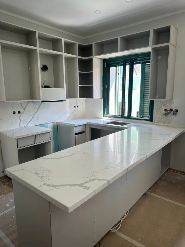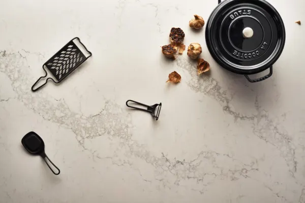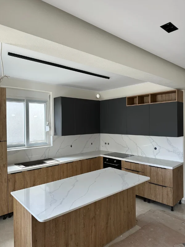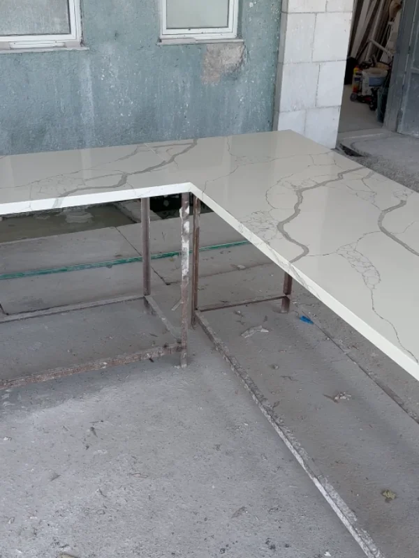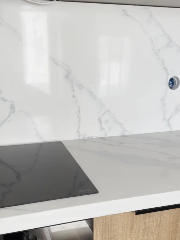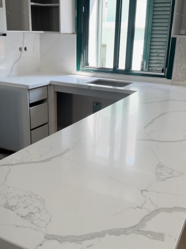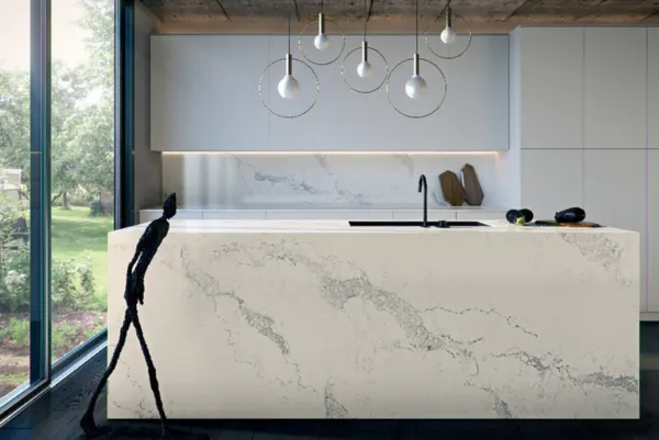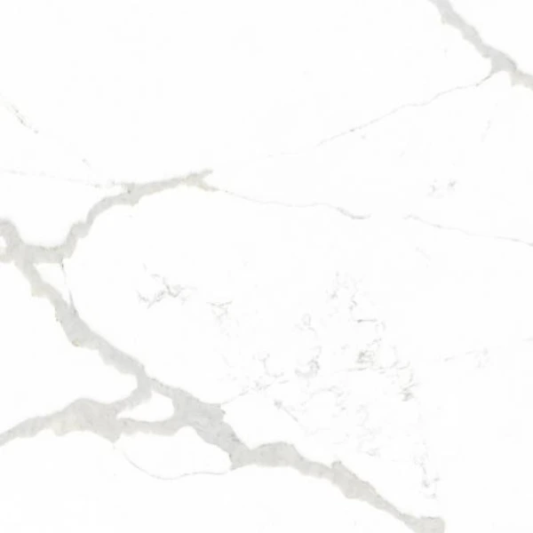 Techno granite with white or off-white base featuring bold gray veins, mimicking natural Calacatta marble.