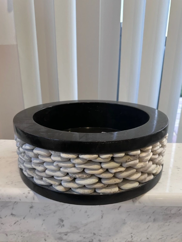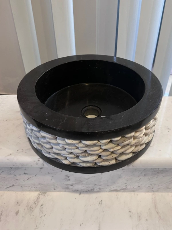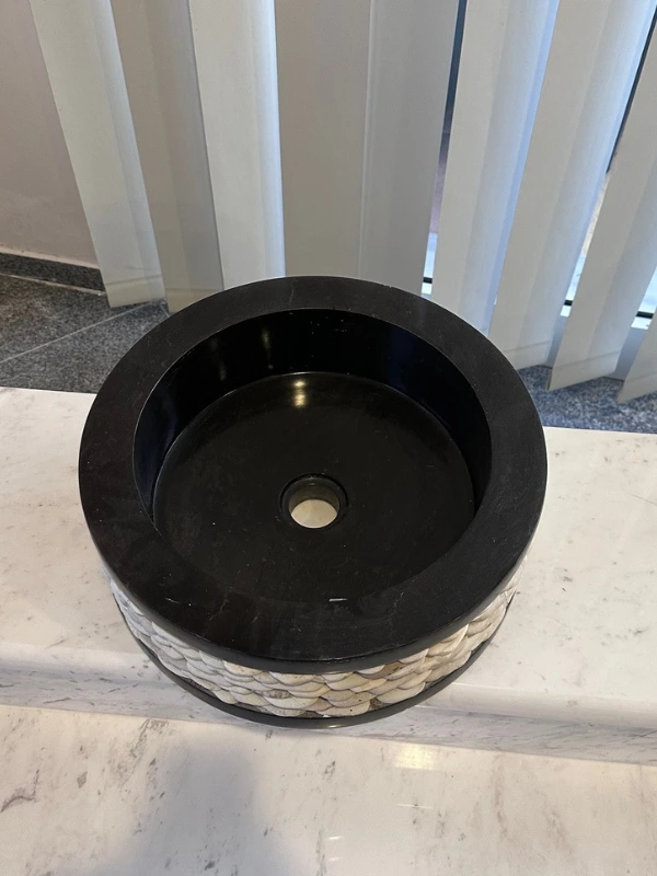 Black polished granite washbasin. It is surrounded by a rim made of white stones.