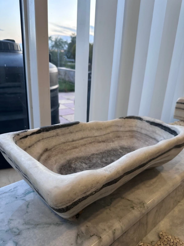 Rectangular washbasin with thick black-gray veins in a matte finish.