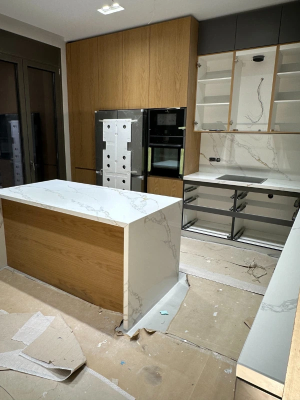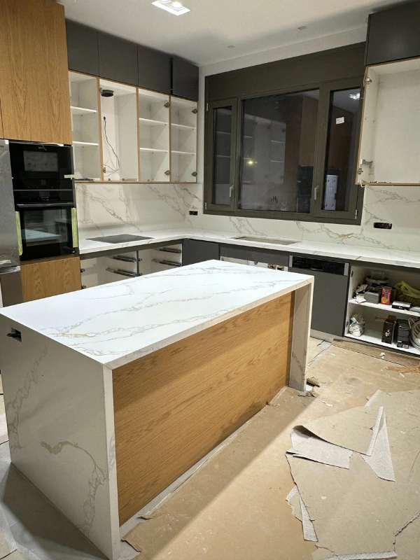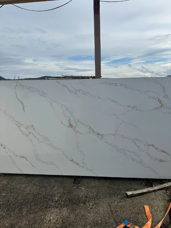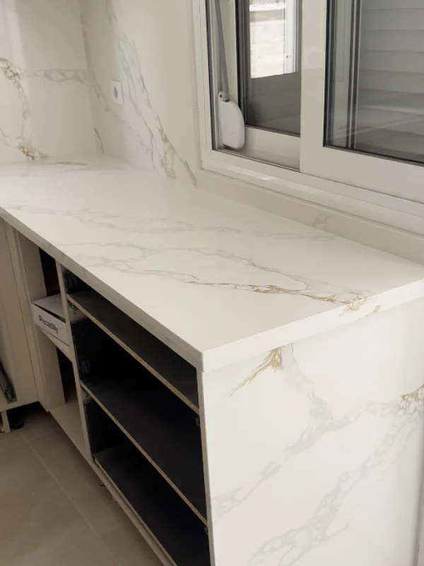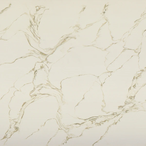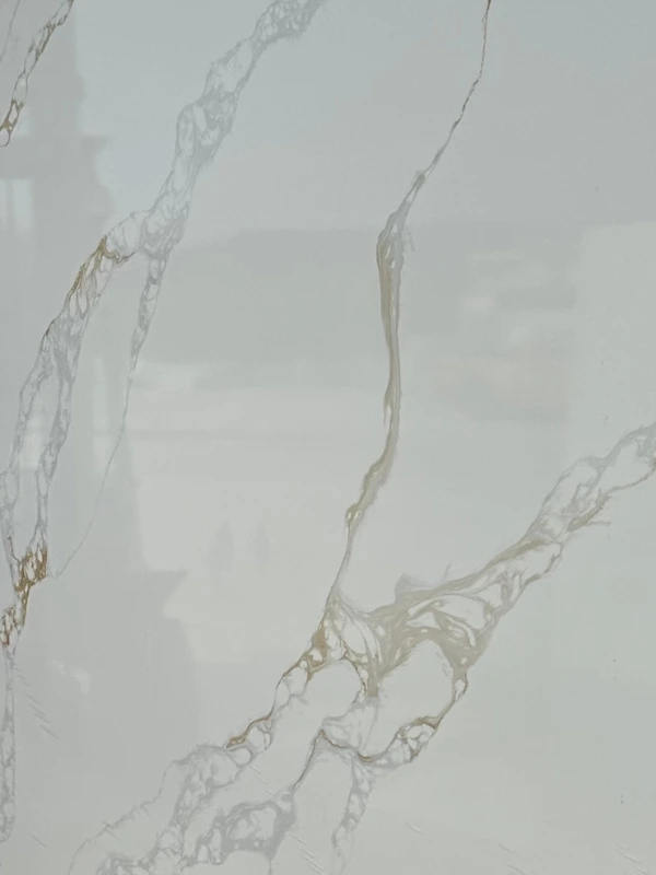 Τεχνογρανίτης με λευκή ή υπόλευκη βάση με μπεζ-χρυσές φλέβες.